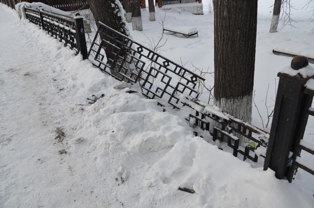 Оказалось, что забор не украли. В результате ДТП серебристый ВАЗ влетел в чугунное ограждение и сломал его пополам. Но восстанавливать ущерб, причиненный исторической ценности, никто не спешит. Елена Львовна Головягина, главный специалист комитета по управлению муниципальным имуществом администрации СГО, комментирует: «В реестре этого забора нет. Кто будет его восстанавливать – мне тоже сложно ответить».