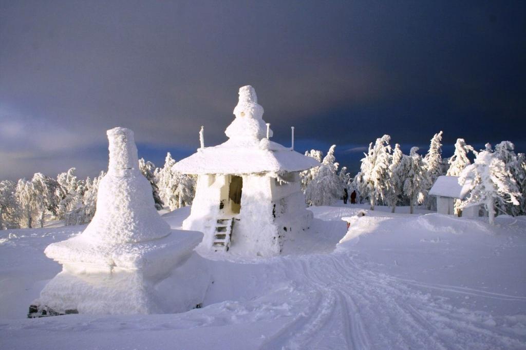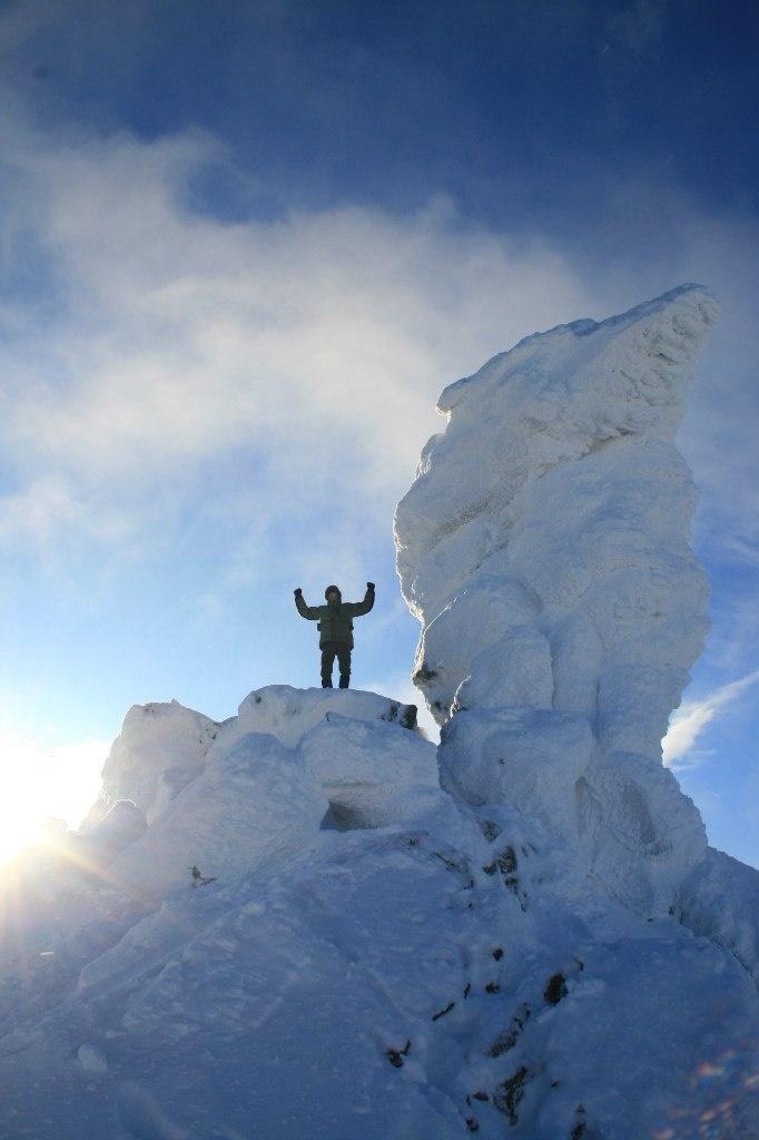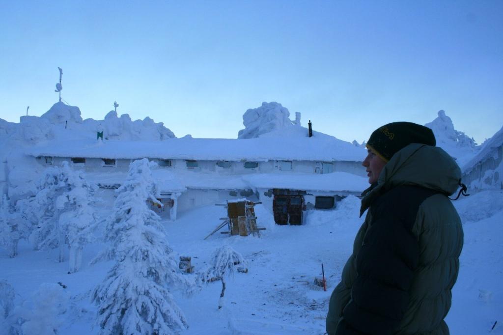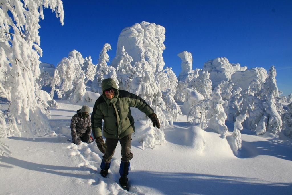 Первая часть подъема проходит по промышленной зоне. Нужно знать, как обойти КПП, не попасться охране и увернуться от мчащихся на полной скорости БелАЗов и другой карьерной техники. По пути нам попадается вереница туристов, уже побывавших наверху. По крупицам выведываем у них информацию. Оказывается, что в эти выходные там ночевало около сорока человек, вершина сейчас в облаке, а на прошлой неделе один пермяк не дошел до горного храма три километра и замерз. Отгоняя плохие мысли, продолжаем путь вверх. Вот уже и пейзаж начинает меняться: небо сливается со снегом, на деревьях снежные надувы, как гнезда птиц, чуть сойдешь со снегоходной трассы – и по пояс в сугробе.