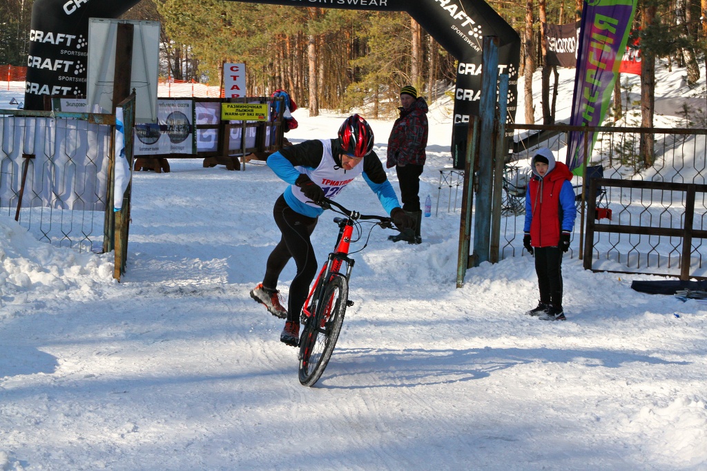 На велоэтапе, выехав с территории лагеря в лес, стало понятно, что с ветерком промчаться не получится. По заснеженной трассе велосипед шел очень напряжённо: сносило из колеи в колею, выбрасывало на целину. Ехать не получалось, большую часть дистанции пришлось толкать велосипед рядом с собой. Хорошая силовая тренировка вышла.