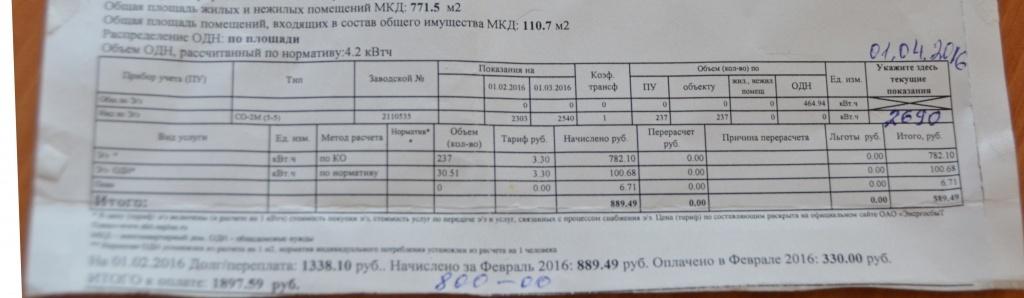 Долг же накопился в связи с тем, что с 2015 года в квитанции появилась строка «общедомовые нужды». Поскольку я не понимала, из чего складывается данная цифра, решила не платить. Такую же позицию заняли почти все остальные жильцы. Но в марте, увидев долг в размере 1338 рублей, я все же пришла в офис «Энергосбыт Плюс» за разъяснением.