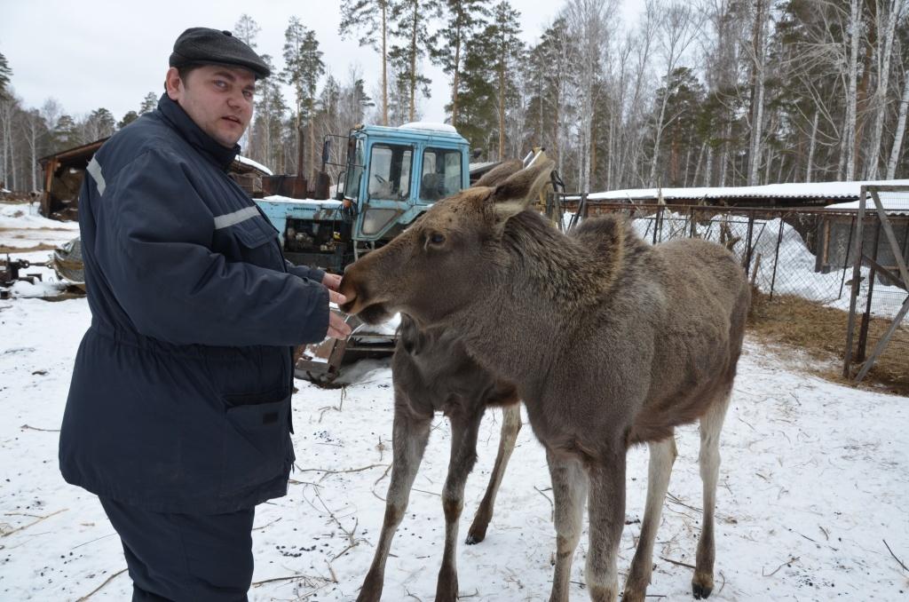 Выходим с ним в загон – а навстречу нам несутся два полутораметровых молодых «скакуна»: лосята любят ветврача, помнят, хоть и видят его всего два раза в году. Да и Денис Анатольевич к ним – как к каждому своему четвероногому пациенту: с любовью и добротой. Из моих рук берут печенье аккуратно, с удовольствием, а один даже голову на плечо кладет в знак благодарности.