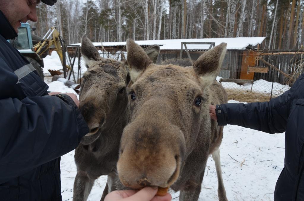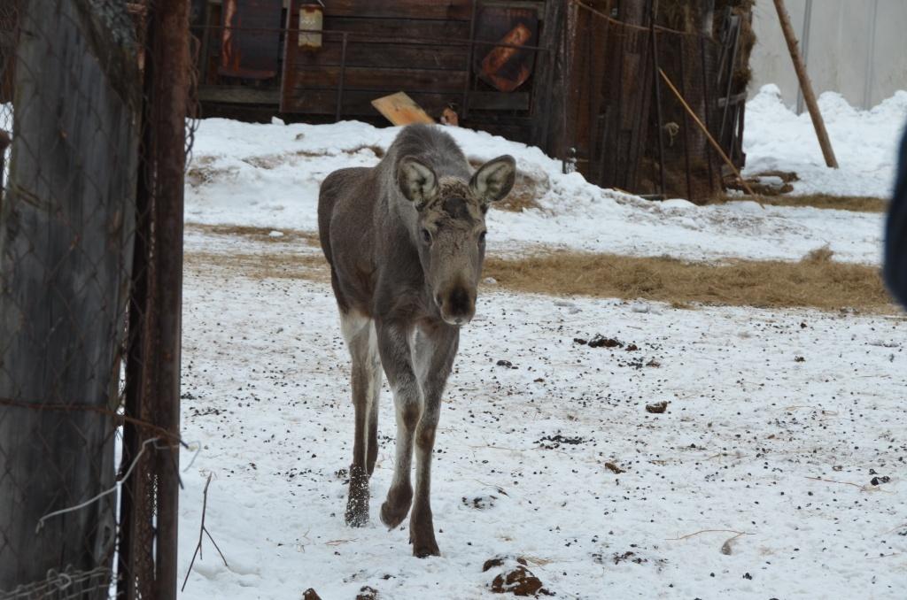 Два лосенка в прошлом году сами пришли к оленеводам: вероятно, потеряли мать, и бродили по лесу в поисках убежища или пропитания. Теперь живут здесь, и ведут себя, как молодые псы. Как только выходят из загона навстречу знакомым людям – прижимают уши, ластятся, прыгают от радости, просят играть, а когда не получают должной ласки и внимания – тихонечко скулят. Денис Анатольевич после обеда берет со стола пару кусочков хлеба и печенье.