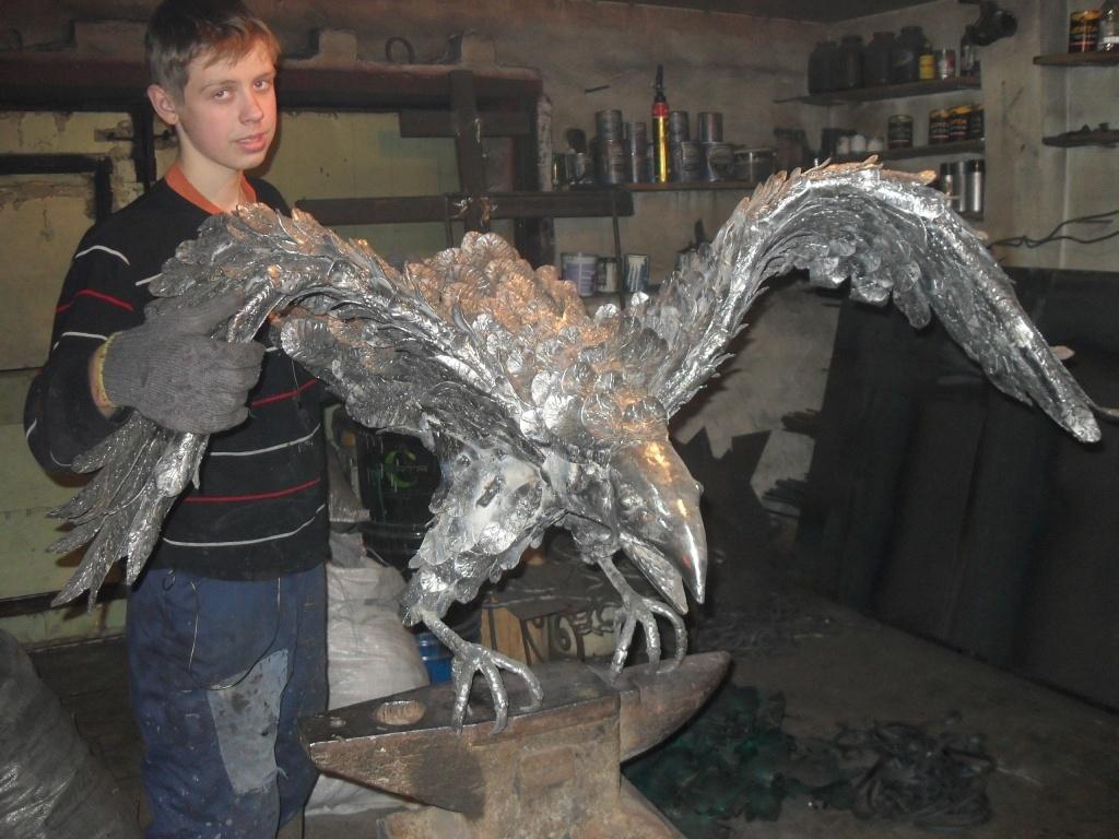 Работать с железом могут только люди с горящим сердцем. Сын Андрея Алексеевича, Евгений, не раздумывая, согласился на предложение отца работать вместе. Так уже почти 6 лет, рука об руку, они создают невероятные вещи, про которые говорят – «на века». Первой совместной работой стал огромный орел. Грозный, крылья в размахе, каждое перышко сделано вручную. Гордую птицу отец и сын выковали за две недели зимних каникул. С тех пор Женя твердо уверен в своей будущей профессии: он обязательно продолжит отцовское дело.