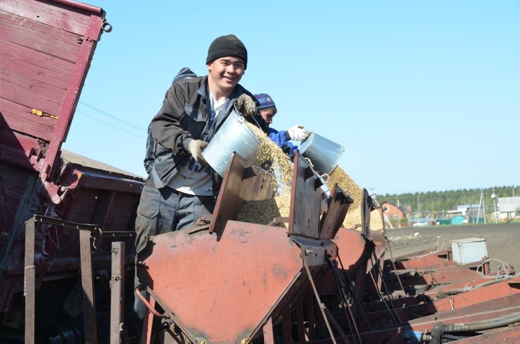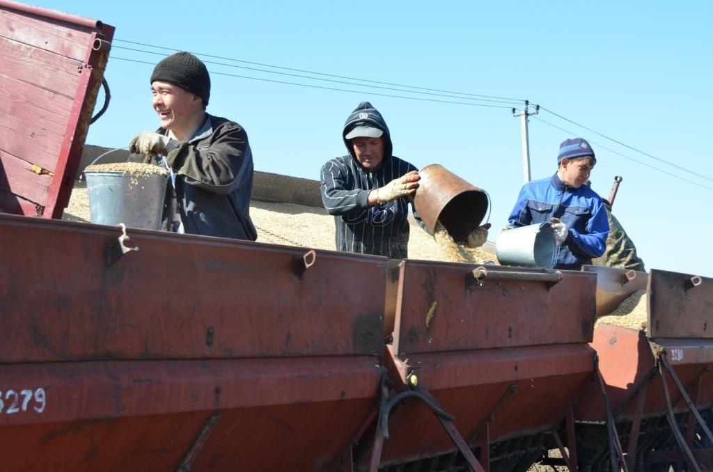 В каждой из этих сеялок – по 4 отсека емкостью 300 килограмм. Мужчины вручную, ведрами, загружают сюда зерно из подъехавшего камаза. По 1,2 тонны за один раз. Людмила Афанасьевна Коробко, главный агроном совхоза, говорит: