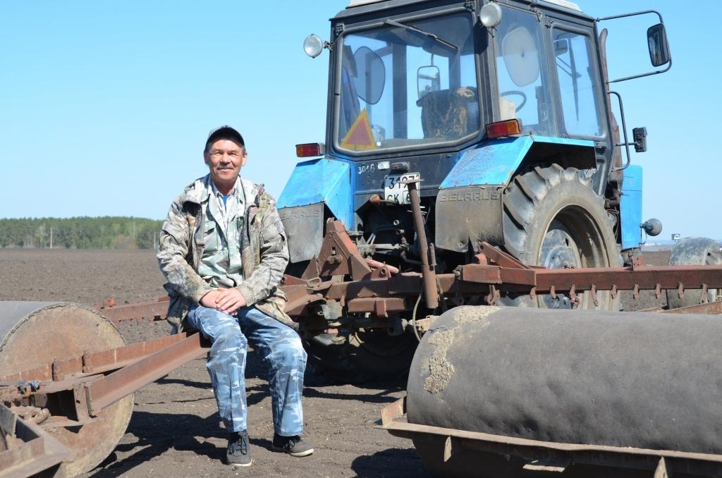 Игорь Рашитович Сабиров широко улыбается: «Здравствуйте, что отвлекаем?». За рулем трактора он уже 35 лет. Сейчас прикатывает посевы, чтобы земля вплотную к семенам прилегла, чтобы они взошли быстрее. Нужно выполнить норму: обработать 40 га, чтобы получить 371 рубль за смену. Вот и приходится стараться – трактор летает по полю со скоростью гоночного болида. Фотографироваться тракторист соглашается с удовольствием, только просит: