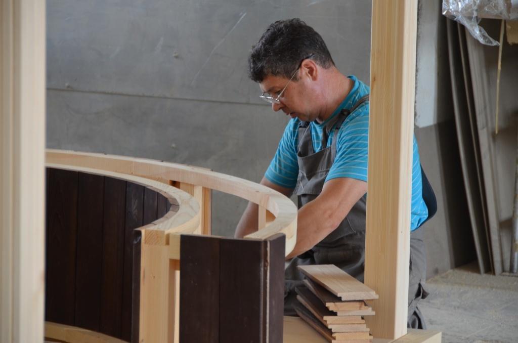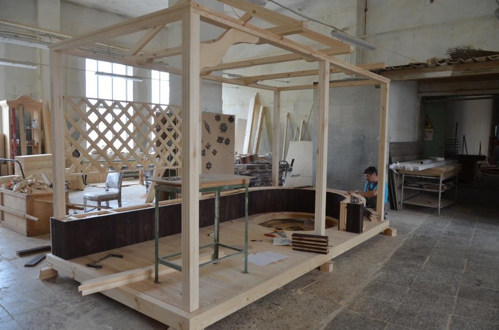 На втором этаже – индивидуальный участок, который здесь еще называют экспериментальным. Тут трудятся столяры-искусники, знатоки своего дела. Из-под из инструментов выходят очень тонкие, изящные, но в то же время качественные и надежные изделия. Виктор Пенских делает беседку по эскизу заказчицы. Оригинал выглядит в несколько раз интереснее наброска.