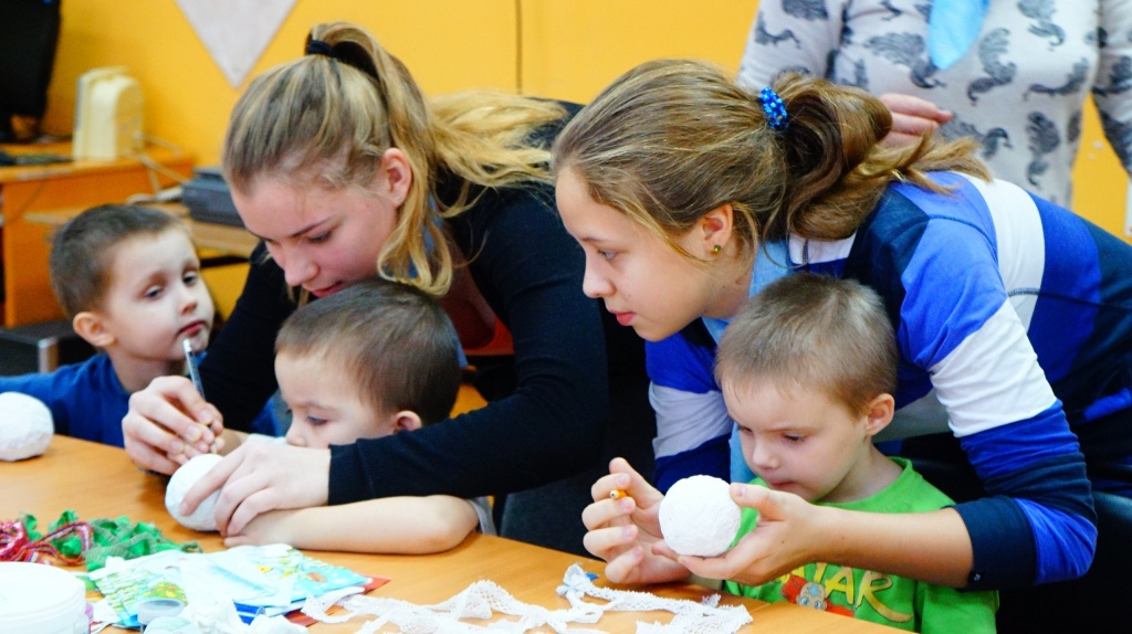В мероприятии приняли участие дети от 3 до 14 лет. Воспитанникам младшей группы предложили заняться «декупажем»: украсить новогодние шары картинками, вырезанными из салфеток. Заготовки шаров наши восьмиклассники сделали своими руками, используя технику папье-маше. Малышам воплотить свои идеи помогали Надежда Конарева и Леся Анкудинова. Они показывали и подробно объясняли каждый этап работы. В результате было изготовлено десять красивых новогодних шаров, которыми ребята украсят новогоднюю елку.