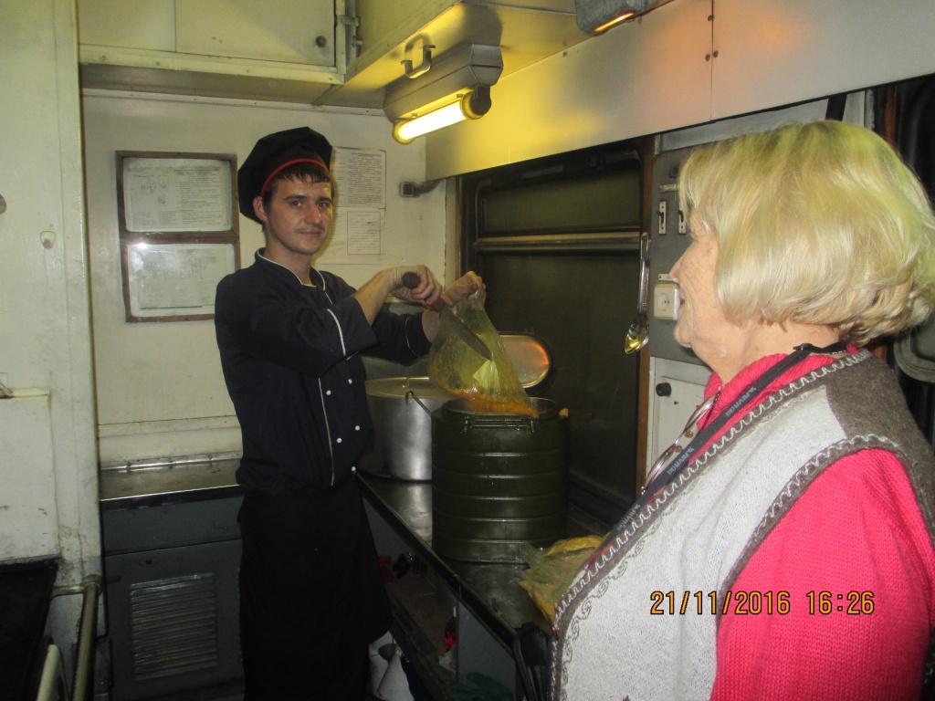 Особое внимание при обходе уделяли кухне. За время своей работы мы сталкивались с разными случаями: бывало, плохо приготовят, и ребята остаются голодными. А как быть сиротам, которых некому собрать в дорогу? Но в этот раз питание было продумано до мелочей. Впервые в составе эшелона ехал отдельный вагон-ресторан, где за кухню отвечали не новобранцы, а вольнонаемные повара и официанты. Еду не готовили, все было заранее сварено и упаковано в вакуумные пакеты. Оставалось только разогреть и в термосах разнести по вагонам. Кормили очень вкусно и сытно: много мяса, все свежее. Соленья, специи, консервы овощные, мясные и рыбные, крупы, овощи.