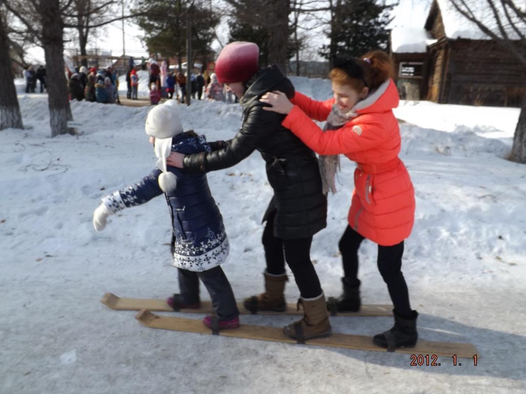 И маленькие, и взрослые могли поучаствовать в гонке «по трое на лыжах», посоревноваться в ходьбе на ходулях, побороться в битве мешками и во множестве других масленичных развлечений. Желающие катались на санях, в которые запряжена лошадка Ласточка.