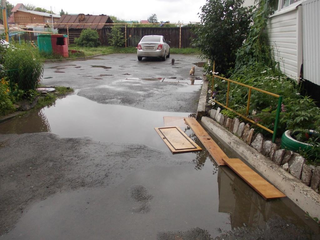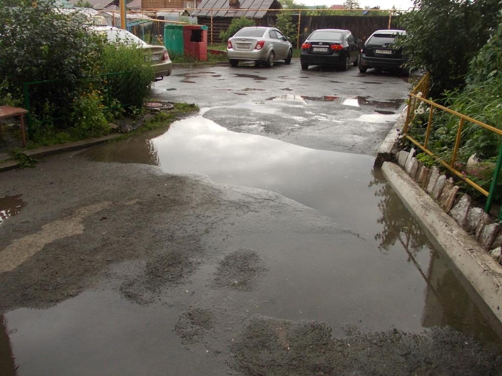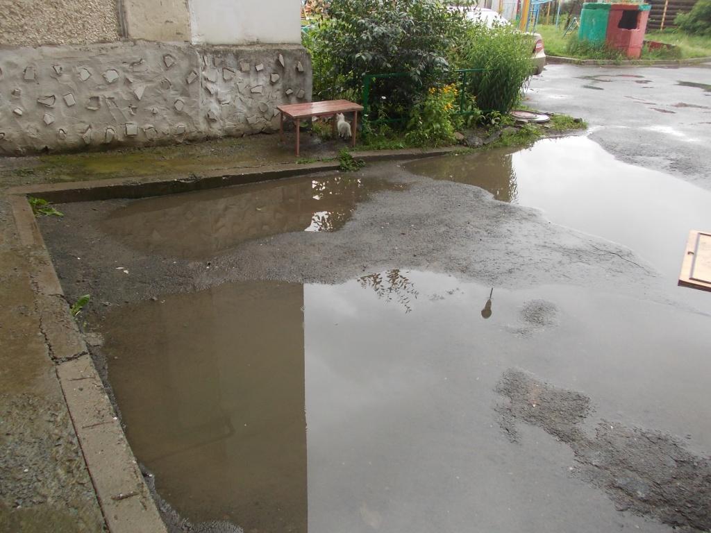 Чрезмерно дождливое лето обострило проблему во дворе нашего дома по улице Тимирязева, 4 в Сысерти. Возле второго подъезда вот уже несколько лет скапливается вода. С каждым годом лужа становится все шире и глубже, асфальт проседает и того и гляди в один прекрасный день провалится совсем.