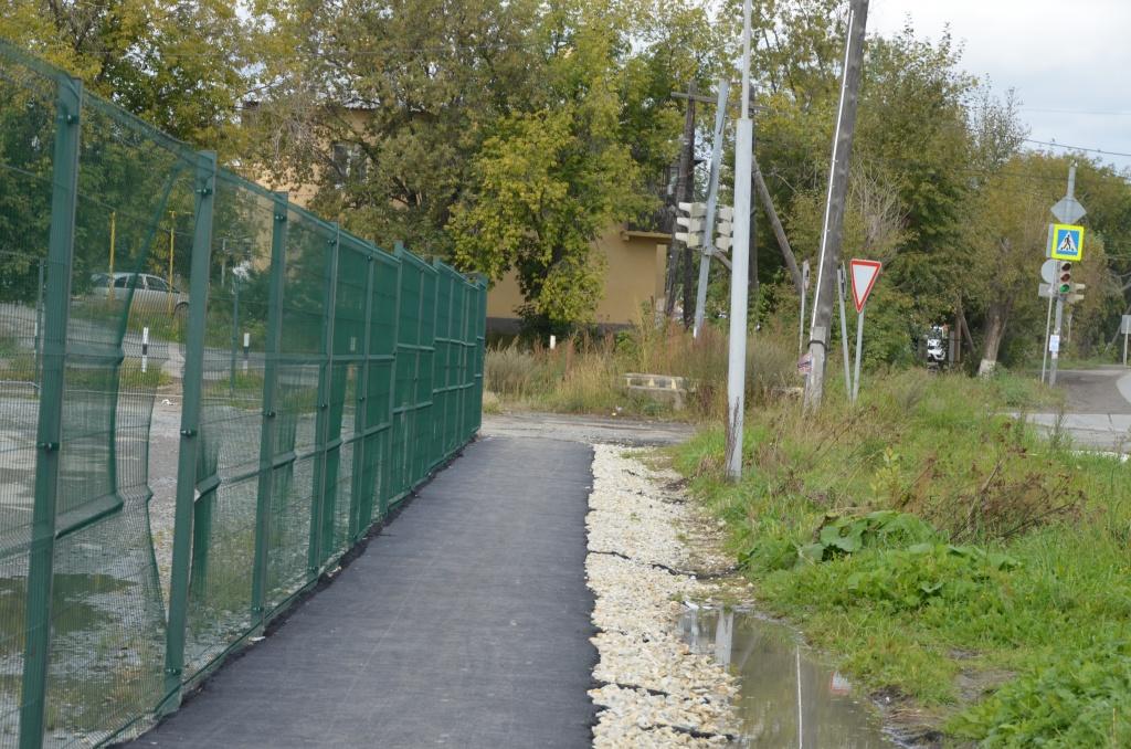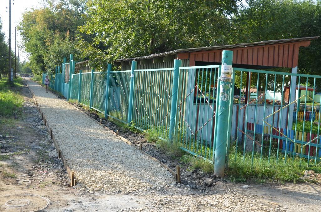 Вдоль нового асфальтового покрытия проложены двухметровые тонюсенькие дощечки. Они кое-как скреплены по краям, а в серединке оттопыриваются. Местами по бокам сделана отсыпка щебнем, но, в основном, обошлись без нее.