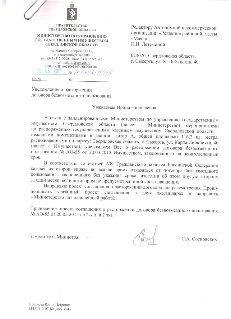 Напомню, это второе письмо, которое мы получили от министерства нынче. Первое пришло 31 августа. В первом письме о «мероприятиях» было сказано более откровенно. Дескать, министерство совместно с администрацией округа в июле провели совещание о возможности предоставления этих площадей муниципальному автономному учреждению «Газета «Сысертские вести», которое было создано по инициативе экс-главы А. Г. Карамышева в нынешнем году.