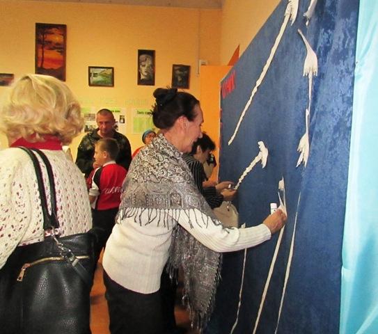 В фойе по завершению концертной части каждый участник прикрепил символ праздника на доску памяти о погибших героях.