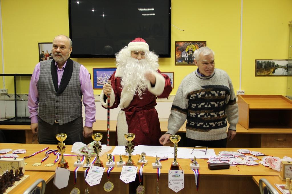 По результатам четырехчасового шахматного марафона Дед Мороз у шикарной елки вручил награды победителям и поощрительные призы участникам. Кубок победителя среди мальчиков завоевал семиклассник школы №23 Александр Стихин, впервые участвуя в турнире. Иван Бабарь из школы №1 занял второе место, а медаль за третье место получил Леонид Вокарев из кадетского корпуса.