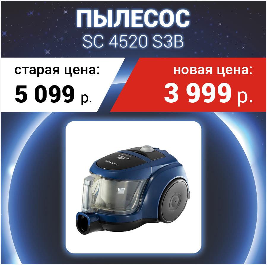 При покупке компактного пылесоса SAMSUNG SC4520 S3B вы можете сэкономить 1 100 рублей и приобрести его по специальной цене 3 999 рублей.