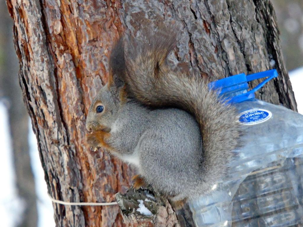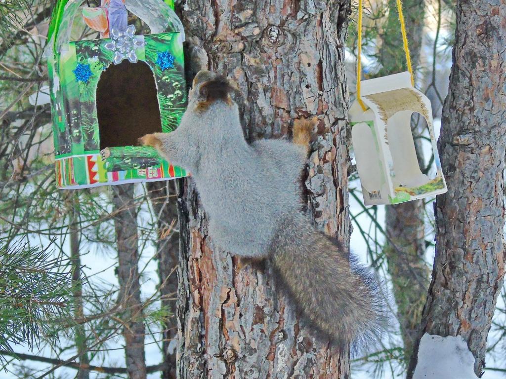 – Сегодня белка проверяла птичьи кормушки. Повесил специально кормушку для белки. Она довольно быстро освоилась. Людей особо не стесняется. Правда, сначала закапывала в снег угощения. Потом, когда заначка была готова, начала спокойно есть из кормушки. Так что, если есть у кого желание пообщаться, несите угощения (орешки, семечки, арахис, сухофрукты и т.д.). Вполне может повезти повидаться с белкой. Адрес – дорожка на вторую гору, рядом с церковью.