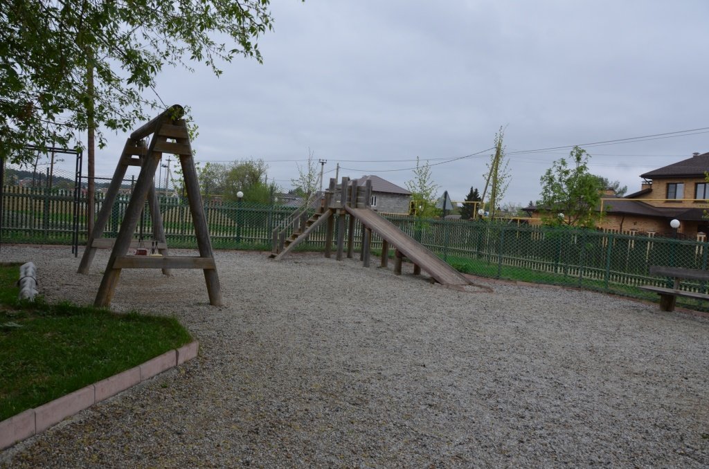 Площадка небольшая. Горки, качели, песочница – для малышни. Скамейка. Турники, брусья, лестницы – для спортивных подростков. Площадка огорожена для безопасности, но калитка без замка, для всеобщего пользования. По периметру липки посажены, они отдельно огорожены от потенциальных коз.