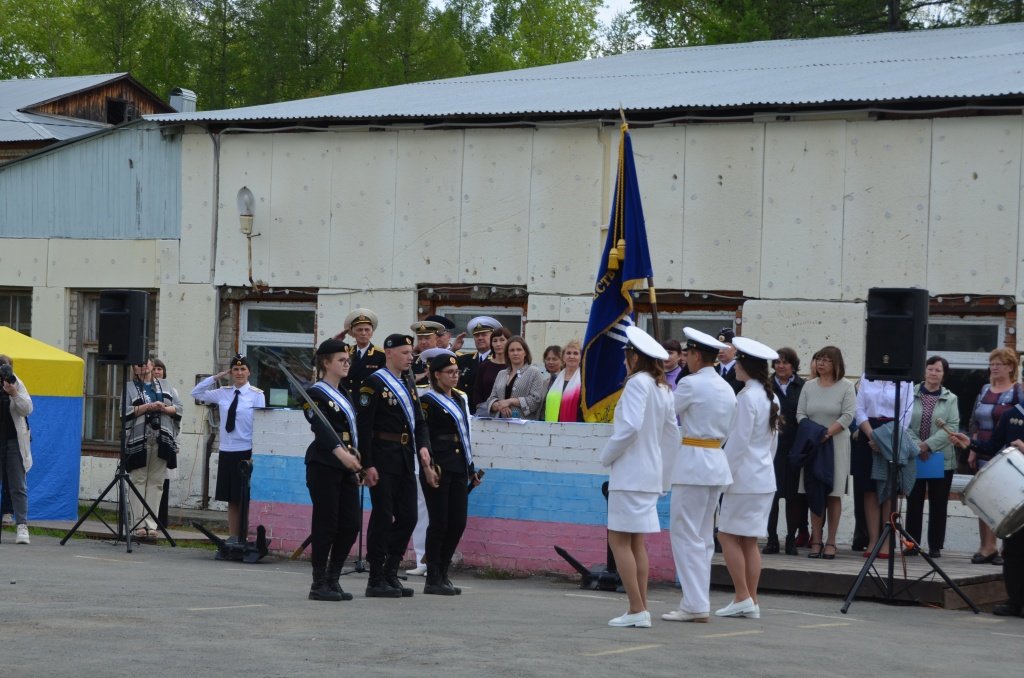 Пятиклассники дают свои пожелания старшакам. Ну а вся школа поет: «Хотите – верьте, хотите – нет. Мы из Сысерти, там моря нет. Но есть уральский кадетский флот. Там адмиральский резерв растет».