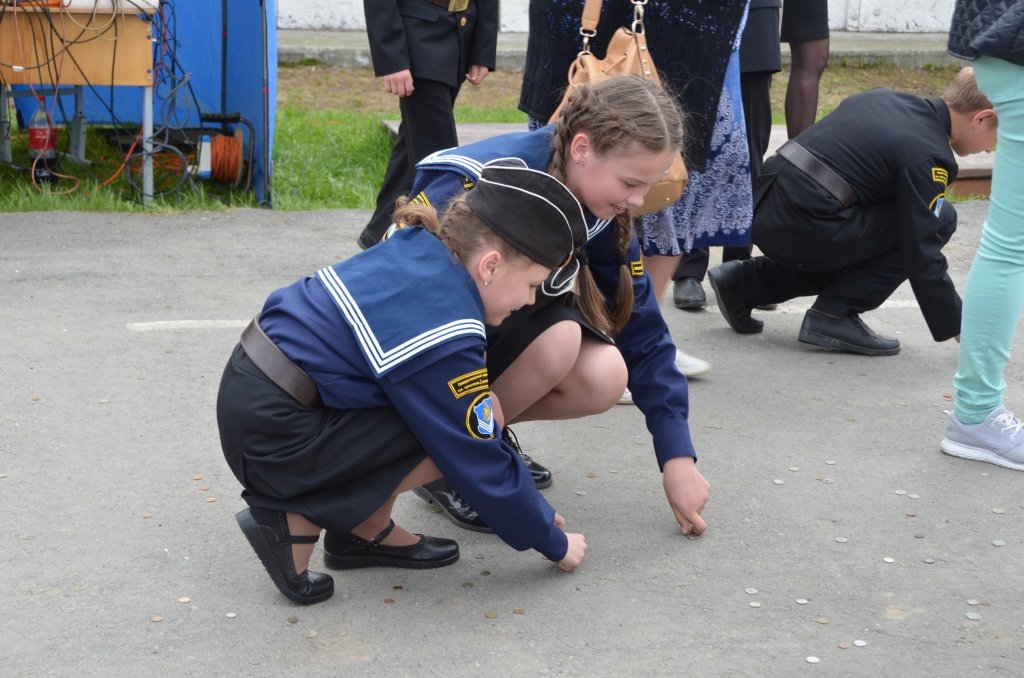 Последний звонок здесь подают в особый судовой колокол – рынду. Еще одна традиция – выпускники бросают монеты на плацу. Малышня их потом собирает.
