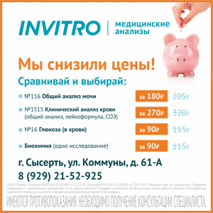 С 1 июля 2019 года медицинская компания ИНВИТРО снизила цены на наиболее популярные лабораторные исследования в Сысерти.