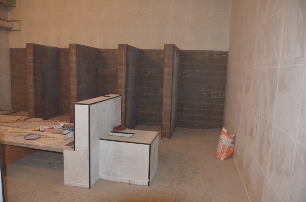 В итоге стены покрыли светлой керамогранитной плиткой, поштукатурили и побелили потолки, полностью поменяли водопровод. Старые трубы до того засорились, что было удивительно, как вода еще текла. Теперь в моечном отделении мужчин будет три душевых.