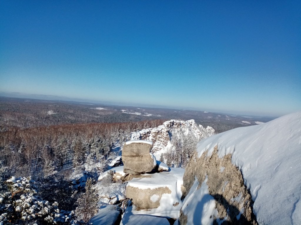 Отличная зимняя солнечная погода сопровождала нас весь день. Поднявшись выше леса на скалы, мы осмотрели окрестности – озеро Аракуль, как на ладони. Дальше видны еще поселки и многие заснеженные озера южного Урала.