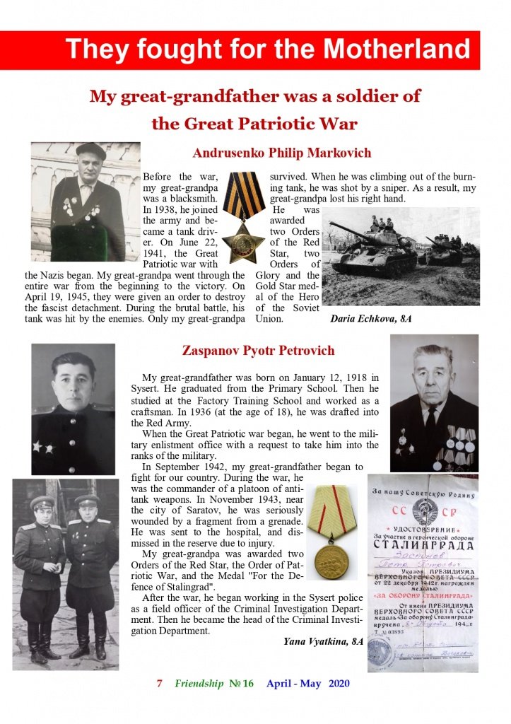 Майский выпуск школьного журнала «Friendship» посвящен 75-й годовщине Победы нашего народа в Великой Отечественной войне. На страницах журнала можно прочитать заметки учащихся о том, как празднуют День Победы в России, а также увидеть их красочные рисунки.