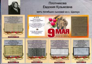 Вот и на днях он прислал нам информацию о щелкунских матерях, потерявших на войне нескольких своих сыновей. Евдокия Кузьмовна Плотникова проводила на фронт шестерых сыновей, а встретила с войны живым лишь одного – Павла Андреевича Плотникова, 1914 года рождения. Александр, самый старший, 1910 г. р., погиб в феврале 1943 года. Этот год забрал еще двоих, оба умерли от ран в госпиталях – 19-летний Василий в августе, 21-летний Георгий в сентябре. Григорий погиб в августе 1942 года, ему было 23 года, 27-летний Петр умер от ран в 1944 году.