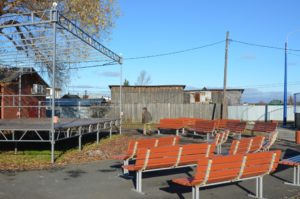 Более того, стационарная сцена появилась еще в прошлом году и на улице, на площадке, где всегда проходили, к примеру, Дни поселка. Но не просто из досок сколоченная, а – скажем так – заводского исполнения. Она построена на средства, полученные первомайцами по федеральной Программе «Комфортная городская среда». А к сцене прилагаются еще и красивые скамейки (на снимке). Настоящий актовый зал под открытым небом получился! Только вот по-настоящему «обкатать» сцены у первомайских доморощенных артистов пока не совсем получается: времена сейчас такие – не сильно праздники с массовым пребыванием людей предполагают.